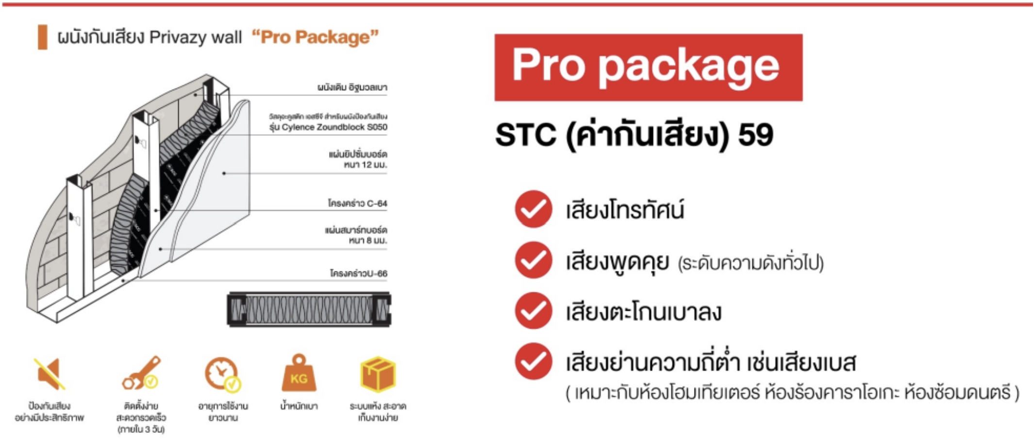 - Mass 2 สร้างผนังเบากันเสียงขึ้นมาใหม่ โดยไม่ยึดติดกับผนังเดิม ภายในช่องว่างอากาศ (Air) จะถูกเติมด้วย “ฉนวนกันเสียง” เช่น แผ่นกันเสียง SCG รุ่น Cylence Zoudnblock ซึ่งเป็นฉนวนใยแก้วที่มีความสามารถในการกันเสียงดังทะลุเข้าออกได้ดี มีค่า STC หรือค่าการต้านทานเสียงสูง เป็นต้น ระบบผนังสองชั้นที่ “ไม่สัมผัสกัน” นี้ จะสกัดกั้นการสั่นสะเทือนของเสียงความถี่ต่ำได้อย่างเด็ดขาด พลังงานเสียงที่ทะลุผนังชั้นนอกเข้ามา จะถูก “ดักจับ” และ “สลาย” ไปในชั้นของฉนวนและอากาศ ก่อนที่จะไปถึงผนังชั้นใน