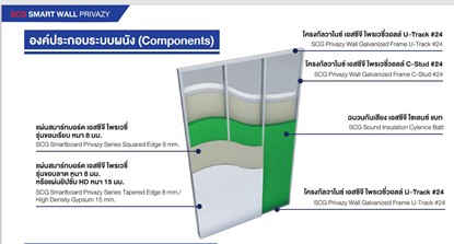 ตัวอย่างระบบผนังเบากันเสียงที่ตอบโจทย์ เช่น ผนังกันเสียง SCG Smart Wall Privazy ที่โดดเด่นด้วยค่า STC สูงถึง 53-66 อีกทั้งผ่านมาตรฐานการทนไฟตามมาตรฐาน BS476 และยังมีความแข็งแกร่งในระดับมาตรฐาน BS5234 Part 2 – 1992 ในระดับ Severe Duty จึงทำให้ไม่เพียงแค่มีประสิทธิภาพในการกันเสียงดังได้ดีเท่านั้น แต่ยังเพิ่มความปลอดภัยให้กับพื้นที่ได้อย่างมีประสิทธิภาพด้วย ซึ่งตอบโจทย์อย่างมากกับธุรกิจห้องพักโรงแรม